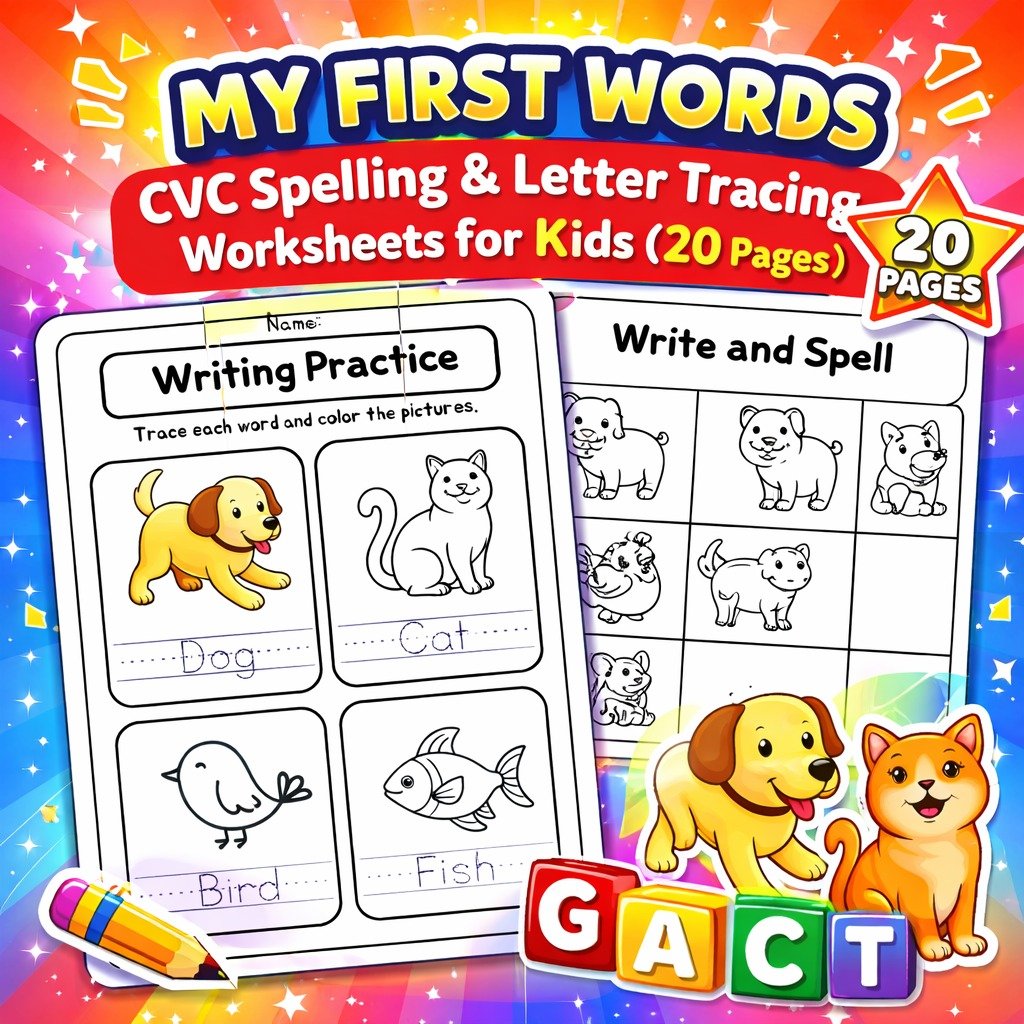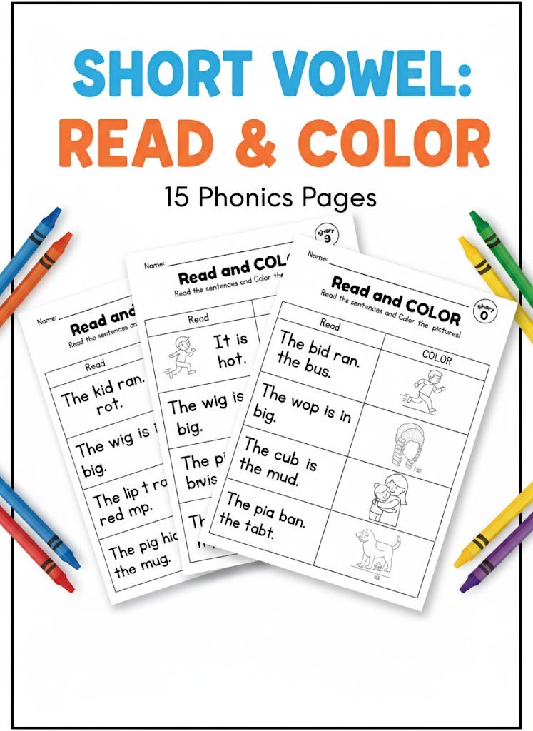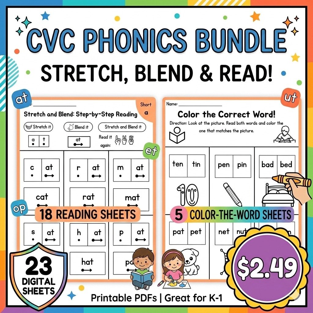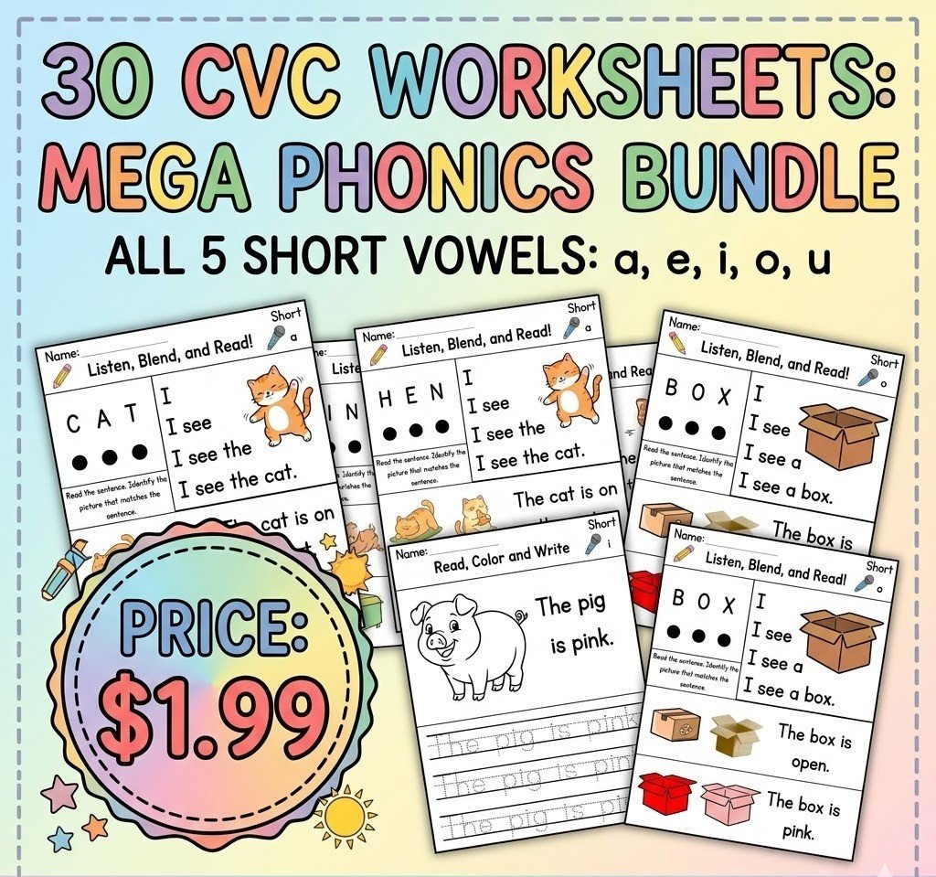 Phonics CVC Words & Missing Middle Sound Worksheet Bundle – 15 Pages